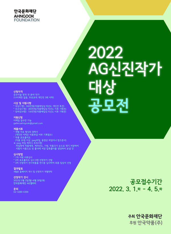 [메디칼업저버 양영구 기자] 안국문화재단은 2022년 AG신진작가대상 공모전 접수를 오는 4월 5일까지 진행한다고 16일 밝혔다.