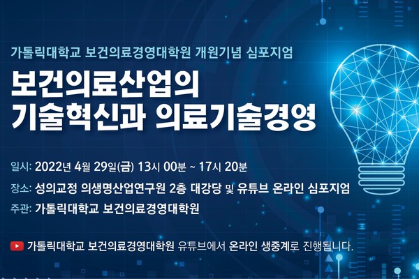 한편 이번 심포지엄은 유튜브 '가톨릭대학교 보건의료경영대학원' 채널에서 생중계된다. 보건의료에 관심 있는 사람이라면 누구나 별도의 참가 신청 없이 온라인 심포지엄에 참가할 수 있다.