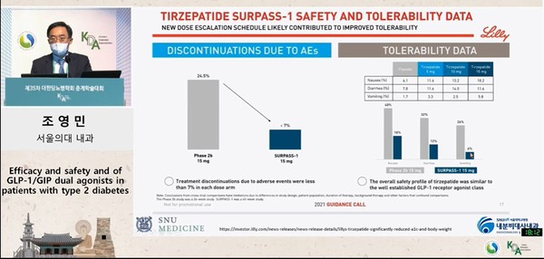 조영민 교수는 "10% 이상 체중감소를 보인 트루리시티군 비율은 9.3%였는데, 티르제파타이드군은 거의 40%에 근접했다"며 "AIC와 체중 감소 효과를 보였지만, 내약성은 좋지 않았다. 트루리시티군 11.2%, 티르제파타이드 15mg군에서 오심, 구통 등의 부작용이 24.5% 발생한 것이다.