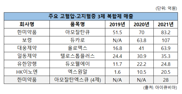 고혈압·이상지질혈증 3제 복합제는 2017년 한미약품이 처음으로 아모잘탄큐를 출시한 이후 가파르게 성장했다.