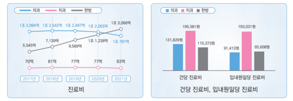 의과와 한방분야의 진료비를 비교했을 때 한방분야의 증가율이 두드러졌다. 먼저 의과분야 진료비는 매해 1조 2000억원대를 유지해왔지만 지난해 1조 787억원으로 10.51% 감소했다.