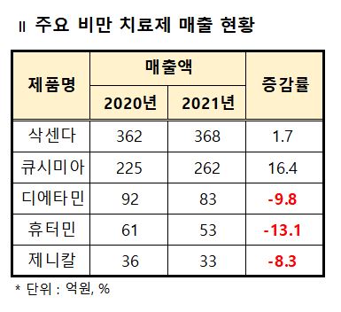 시장조사기관 아이큐비아에 따르면 삭센다는 2021년 368억원의 매출로 시장 1위를 유지했다. 이는 2020년 대비 1.7% 성장한 수치다.