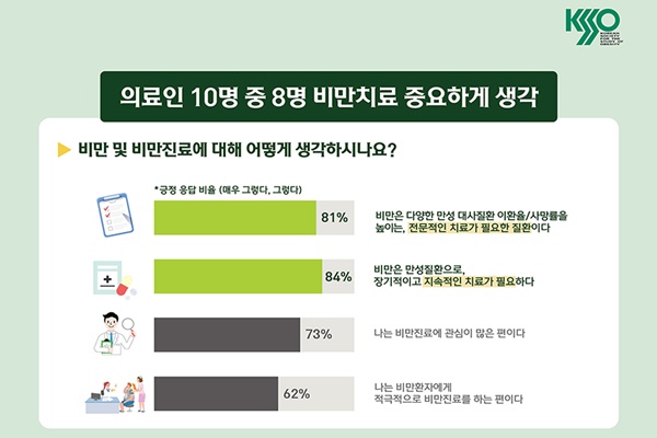 전체 응답자 10명 중 8명(81%)은 '비만은 다양한 만성 대사질환 이환율 및 사망률을 높이는 전문적인 치료가 필요한 질환'이라고 답했다.