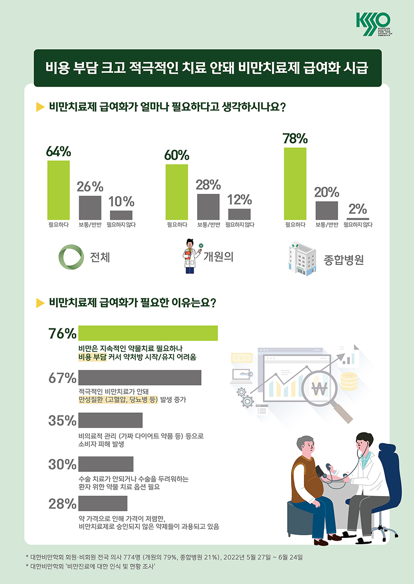 이번 조사에서도 의사의 진료와 상담, 비만치료제, 영양/운동 상담의 급여화가 필요하다는 의견이 항목별로 60% 이상으로 나타났다.