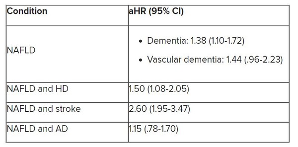 세부 데이터를 보면, NAFLD 시 치매 발생 aHR 1.38(1.10~1.72), 혈관성치매 1.44(.96~2.23)였다. NAFLD 및 심혈관질환이 있을 때는 1.50(1.08~2.05), NAFLD 및 뇌졸중 2.60(1.95~3.47), NAFLD 및 알츠하이머병이 동반됐을 때는 1.15(0.78~1.70)로 분석됐다.