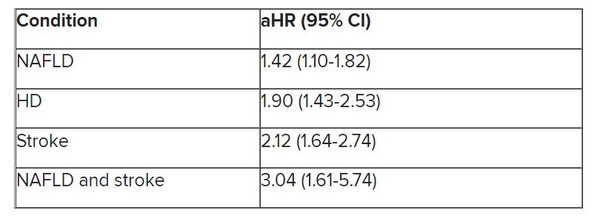 구체적으로 NAFLD 1.42(1.10~1.82), 심혈관질환 1.90(1.43~2.53), 뇌졸중 2.12(1.64~2.74), NAFLD+ 뇌졸중 3.04(1.61~5.74)였다.