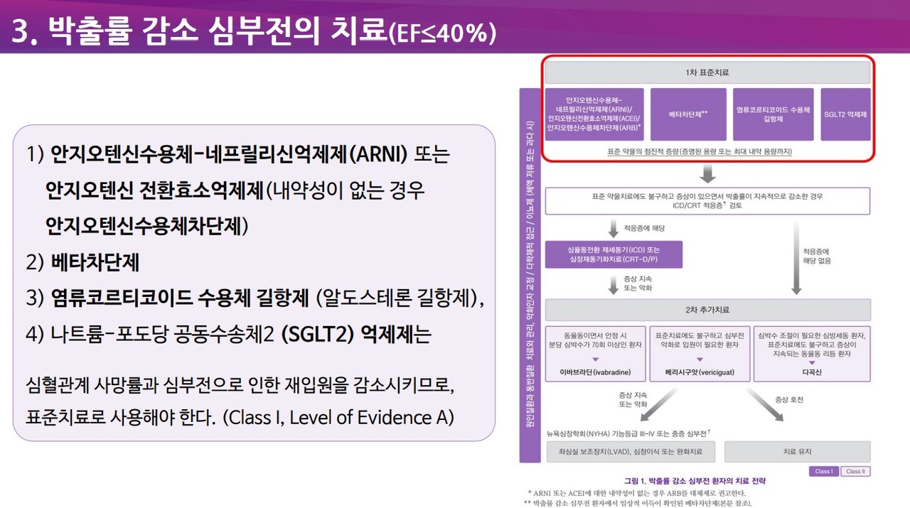 이에 따라 진료지침에서는 △안지오텐신수용체-네프릴리신억제제(ARNI) 또는 안지오텐신 전환효소억제제(ACEI)(내약성이 없다면 안지오텐신수용체차단제(ARB)) △베타차단제 △염류코르티코이드 수용체 길항제(MRA) △SGLT-2 억제제 등 네 가지를 HFrEF 1차 표준치료로 제시했다.