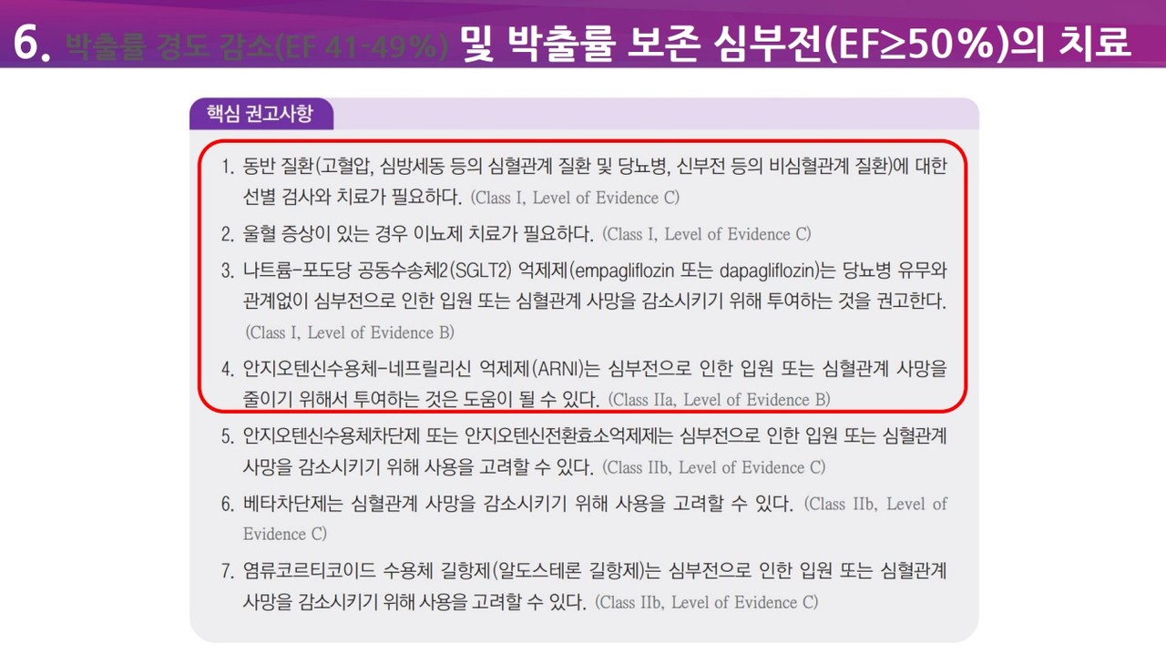 지난 4월 발표된 미국심장학회·심장협회·심부전학회(ACC·AHA·HFSA) 심부전 관리 가이드라인에서는 SGLT-2 억제제를 Class IIa로 권고한 것과 비교하면 권고등급이 높다.