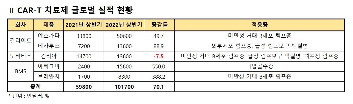 또 다른 CAR-T 제품인 브레얀지(리소캅타진 마라류셀)도 2021년 상반기 1700만달러에서 올해 상반기 8300만달러로 388.2% 매출이 증가했다.