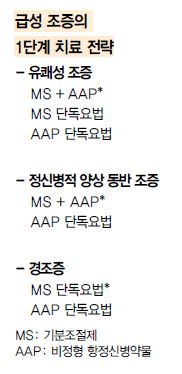 유쾌성 조증과 경조증의 초기치료 전략에 대해서는 기분조절제 + 비정형 항정신병약물 병합요법, 기분조절제 혹은 비정형 항정신병약물 단독요법이 1차선택이었고, 정신병적 양상을 동반한 조증에서는 기분조절제 + 비정형 항정신병약물 병합요법이 최우선 치료, 비정형 항정신병약물 단독요법이 1차선택이었다.