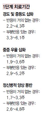 정신병적 양상을 동반하지 않은 심한 우울증에는 기분조절제 + 비정형 항정신병약물 병합, 비정형 항정신병약물 + 라모트리진 병합, 기분조절제 + 라모트리진 병합요법을 1차전략으로 적용하도록 했고, 정신병적 양상을 동반한 심한 우울증에는 기분조절제 + 비정형 항정신병약물 병합요법이 최우선 치료전략이었다. 비정형 항정신병약물 + 라모트리진 병합요법은 1차치료 전략이었다.