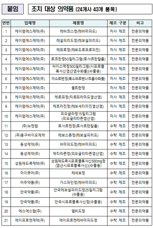 [메디칼업저버 손형민 기자] 식품의약품안전처는 의약품 제조업체 케이엠에스제약에서 제조한 ‘레바코스정’ 등 43개 품목(자사제조 10, 수탁제조 33)에 대해 잠정 제조·판매 중지하고 회수 조치한다고 20일 밝혔다.
