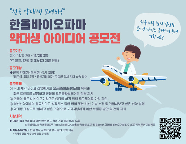 [메디칼업저버 손형민 기자] 한올바이오파마(공동대표 박승국, 정승원)는 미국 현지 법인 및 보스턴 바이오텍 클러스터 투어 기회를 제공하는 ‘약대생 아이디어 공모전’을 개최한다고 7일 밝혔다.