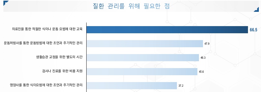 또 개개인의 시간과 여유에 따라 쉽게 접근 가능한 휴대폰 애플리케이션을 통한 관리에 대한 요구도 60.2%로 높았으며, 고령일수록, 광역시 또는 중소도시에 거주할수록 이러한 휴대폰 앱을 통한 관리 요구도가 컸다. 보건소 방문을 통한 관리는 47.3%가 희망했고 고령에서 요구도가 높았다.