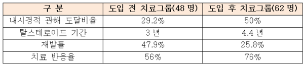 내시경적 관해에 도달한 비율 역시 도입 전 치료 그룹(48명)의 경우 29.2%(14명)이었던 반면, 도입 후 치료 그룹(62명)은 50%(31명)에 달했다.