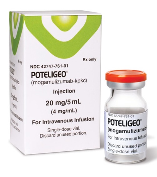 포텔리지오는 균상식육종 및 시자리증후군과 같은 T세포의 악성종양세포에서 자주 발현되는 C-C 케모카인 수용체4형(CCR4)를 표적하는 인간화 단클론 항체다.