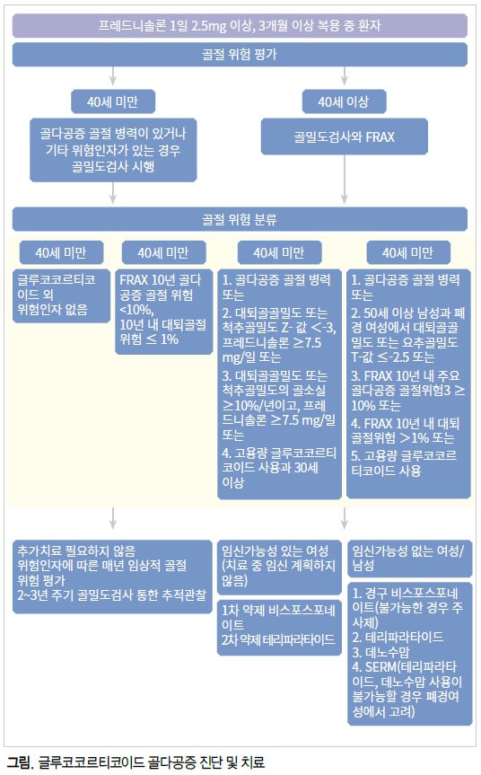치료 전략은 프레드니솔론 1일 2.5mg 이상을 3개월 이상 복용 중인 모든 환자에게 칼슘(800~1000mg)과 비타민 D(800IU)를 투여해 적절한 혈중 비타민 D 농도(≥20ng/mL)를 유지하도록 권고했다. 중등도 이상의 골절 위험이 있을 경우에는 골다공증 치료제의 사용을 권고한다. 한편 글루코코르티코이드가 스켈로스틴 분비를 증가시키기 때문에 로모소주맙이 GIOP의 새로운 치료제로 기대되고 있지만, 현재까지 GIOP 환자들을 대상으로 진행된 연구가 제한적이라고 부연했다.