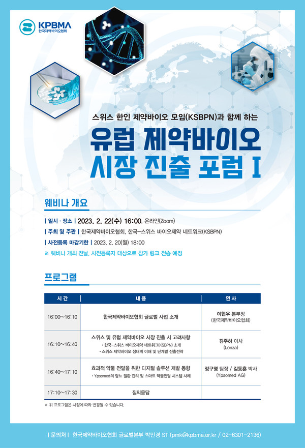 [메디칼업저버 손형민 기자] 한국제약바이오협회는 한국-스위스 바이오제약 네트워크(KSBPN)와 오는 22일 오후 4시부터 온라인(Zoom)으로 국내 제약바이오 기업들을 대상으로 ‘유럽 제약바이오 시장 진출 포럼’을 개최한다고 17일 밝혔다.