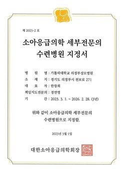 [메디칼업저버 박선혜 기자] 가톨릭대 의정부성모병원(병원장 한창희)이 소아응급의학 세부전문의 수련병원에 지정됐다.
