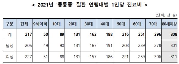 등 통증 환자의 건강보험 총 진료비는 2017년 8148억 원에서 2021년 1조 1883억 원으로 2017년 대비 45.8%(3,735억 원) 증가했고, 연평균 증가율은 9.9%로 나타났다.