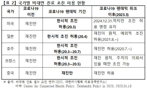 한편, 비대면 진료를 오랫동안 시행해 온 해외 국가에서도 코로나19 이전 초진은 허용되지 않은 상황이다.