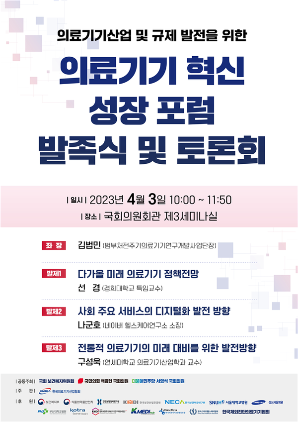 더불어민주당 서영석 의원과 국민의힘 백종헌 의원이 공동주최하고, 사단법인 한국의료기기산업협회가 주관하는 이번 포럼은 오는 4월 3일 오전 10시 국회 의원회관 제3세미나실에서 개최된다.