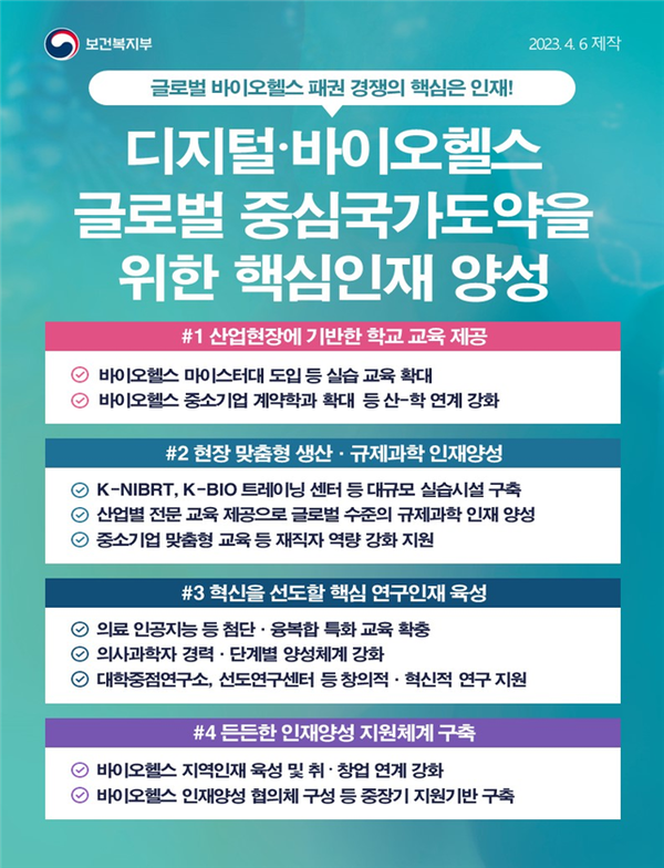 보건복지부는 6일 제20회 국정현안관계장관회의에서 관계부처 합동으로 마련한 바이오헬스 인재양성 방안을 발표했다.