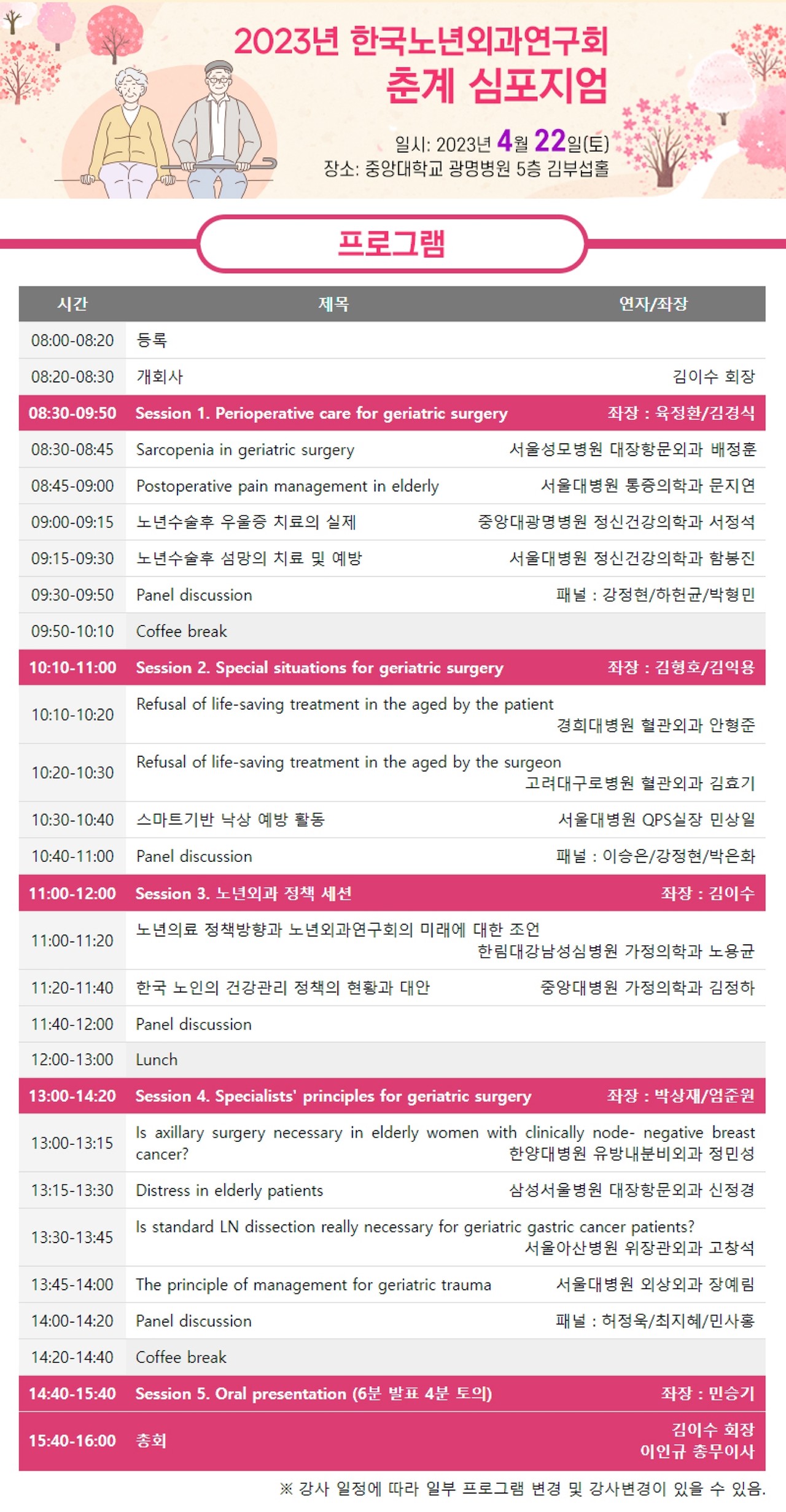 심포지엄에서는 국내 노년외과 분야의 전문가들과 노년내과학회 임원들이 연자로 나서 최신 지견 및 경험과 다양한 임상증례 등을 공유하고 학문적 토론의 장이 열릴 예정이다.