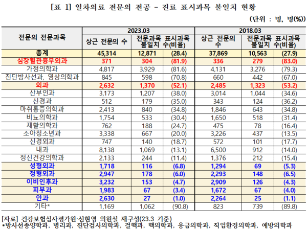 심평원으로부터 제출받은 자료에 의하면 2023년 3월 기준 일차의료 상근 전문의 4만 5314명 중 1만 2871명(28.4%)이 전공과 진료 표시과목이 불일치했다. 5년전 1만 563명 보다 2218명 증가한 것으로 확인됐다.