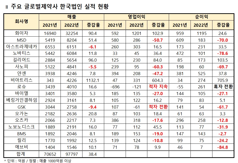 이 같은 실적 성장은 상위권에 포진한 글로벌 제약사들이 이끌었다. 특히 영업이익, 순이익 등 수익성 지표도 상위사 중심이었다.
