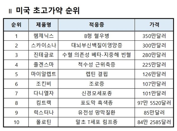 미국에서 초고가약 상위 10개 약물에 이름을 올린 치료제의 공통점은 희귀질환을 타깃한 약물과 유전자 치료제라는 점이다.
