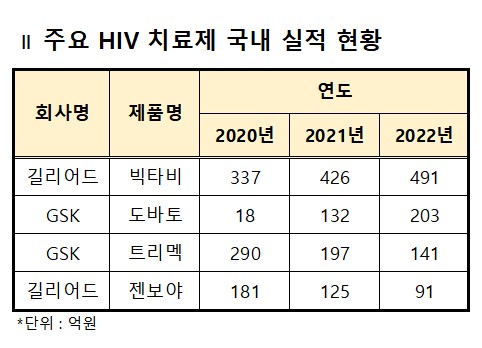 한국 HIV 치료제 시장은 길리어드 빅타비(성분명 빅테그라비르/엠트리시타빈/테노포비르알라페나미드)가 강자로 군림하고 있다.