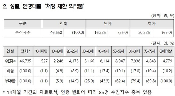 하지만 인 의원이 보건복지부 제출 자료를 분석한 결과 2021년 11월 2일~2022년 12월 31일까지 약 14개월간 4만 6650명의 수진자에게 건강보험 급여가 적용되는 ‘처방 제한 의약품’이 처방됐으며, 건수는 5만 8495건에 달했다.