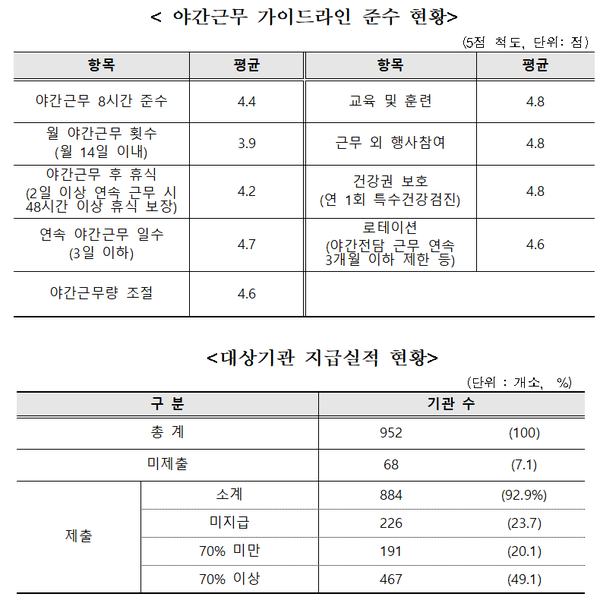미지급한 기관을 제외한 나머지 기관(658개소) 중 간호사에게 야간간호 특별수당을 지급한 기관은 495개소(75.2%), 간호사를 추가 채용한 기관은 82개소(12.5%), 수당 및 간호사 추가 채용을 모두 시행하고 있는 기관은 81개소(12.3%)였다.