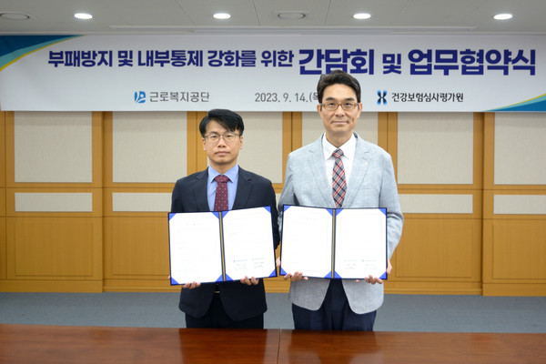 [메디칼업저버 박서영 기자] 건강보험심사평가원과 근로복지공단은 지난 14일 근로복지공단 본사 회의실에서 내부통제 강화와 청렴문화 확산을 위한 업무 협약식 및 간담회를 진행했다고 밝혔다.