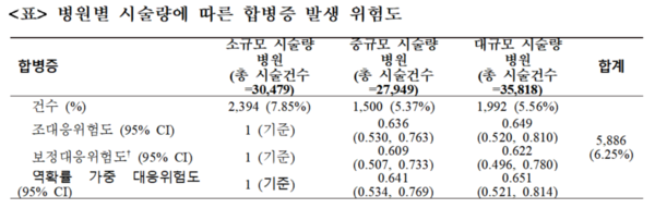 소규모 병원 대비 대규모 병원은 약 35%(0.651배), 중간규모 병원은 약 36%(0.641배) 합병증 발생 위험이 낮은 것으로 조사됐다. 대규모 병원과 중간규모 병원 사이에는 유의한 합병증 발생 위험 차이가 없었다.