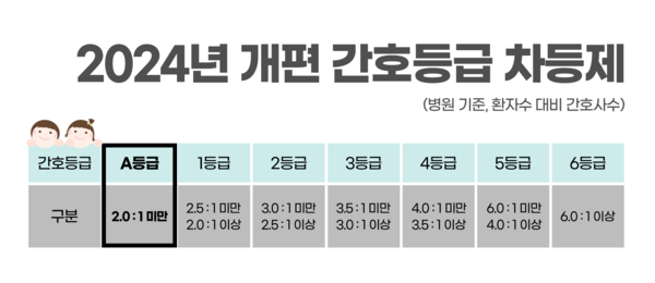 기존 간호등급은 1등급부터 7등급까지였지만, 최근 정부의 3차 상대가치점수 개편에 따라 병원 기준 최고 등급인 A등급이 신설됐다.