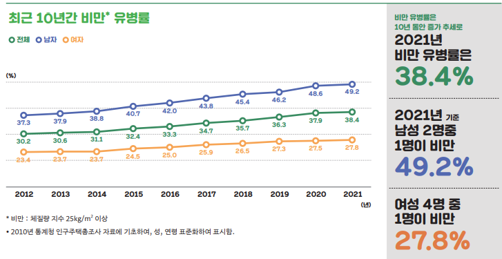 팩트시트에 따르면, 2021년 성인 전체의 비만 유병률은 38.4%였다. 여성은 2012년 23.4%에서 2021년 27.8%로 비교적 완만히 증가한 반면, 남성은 2012년 37.3%에서 2021년 49.2%로 약 1.3배 증가했다. 이는 전체 성인 남성 2명 중 1명이 비만에 해당하는 셈이다.