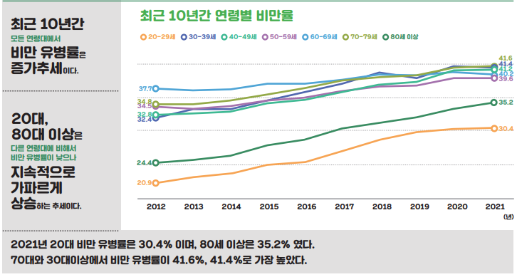 2021년 전체 성인의 연령별 비만 유병률은 △20대 30.4% △30대 41.4% △40대 41.2% △50대 39.6% △60대 40.2% △70대 41.6% △80대 이상 35.2%로, 70대, 30대, 40대 순으로 가장 높았다.
