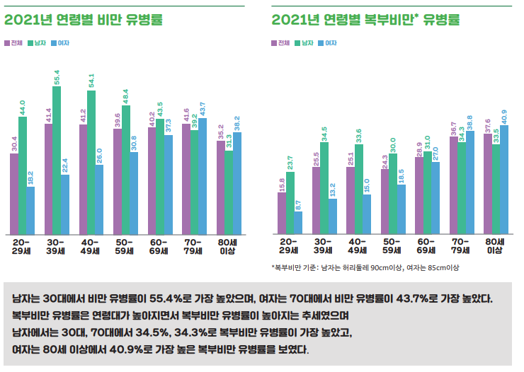 2021년 남성과 여성 연령별 비만 유병률은 남성은 30대가 55.4%로 가장 높은 비만 유병률을 보였고 이어서 △40대(54.1%) △50대(48.4%) 순으로 중년층에서 높은 비만 유병률을 보였다.