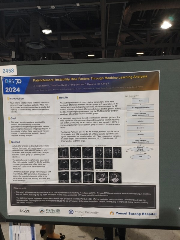 [메디칼업저버 신형주 기자] 연세사랑병원과 서울아산병원, 의료기기업체 스카이브 연구팀이 미국 캘리포니아에서 열린 미국정형외과연구학회(ORS)에서 ‘인공지능(AI)를 이용한 소아에서 슬개골 아탈구에 대한 위험요소를 분석해 포스터 발표를 진행해 눈길을 끌고 있다.