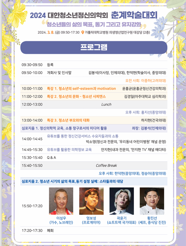 대한청소년정신의학회는 다음달 8일 서울 가톨릭대학교병원 의생명산업연구원 대강당에서 ‘2024 대한청소년정신의학회 춘계학술대회’를 연다.