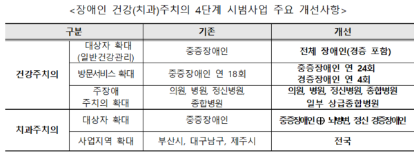 올해부터 시행되는 4단계 사업은 의원급에서 제공하는 △일반건강관리 대상을 중증장애인에서 경증장애인까지 모든 장애인으로 확대 △방문서비스 횟수를 확대(중증 연 18회→중증 연 24회, 경증 연 4회) 제공 △주장애관리 기관에 일부 상급종합병원을 포함해 보다 다양한 의료기관이 사업에 참여할 수 있도록 한다.