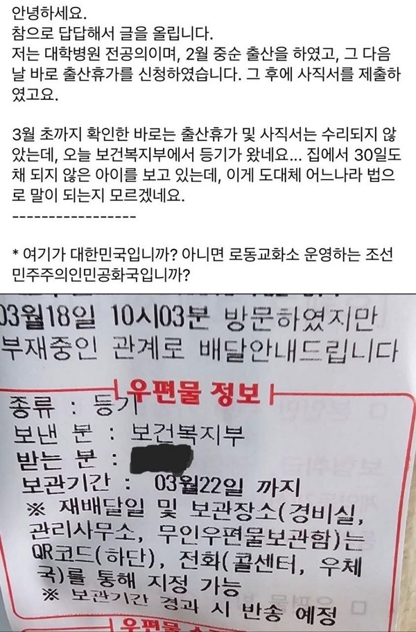 해당 전공의는 "집에서 30일도 채 되지 않은 아이를 보고 있는데, 이게 도대체 어느나라 법이냐"며 "대한민국인지 로동교화소를 운영하는 조선민주주의인민공화국인지 알 수 없다"고 토로했다.