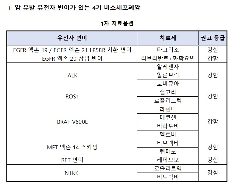 이외에 ALK 유전자 변이 4기 비소세포폐암 환자의 1차 치료옵션으로는 △로슈 알레센자(알렉티닙) △다케타 알룬브릭(브리가티닙) △화이자 로비큐아(롤라티닙)을 높은 근거 수준의 강한 권고 등급을 부여했다.