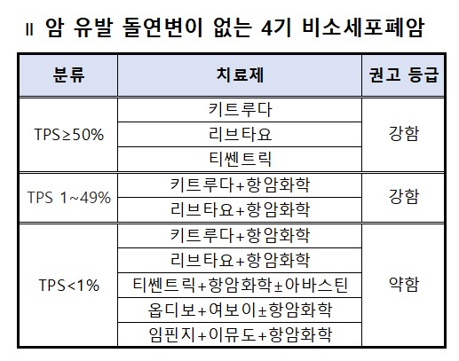 이외에 △티쎈트릭+카보플라틴+냅파클리탁셀±아바스틴 병용요법 △옵디보+여보이±백금기반 화학요법 △임핀지+이뮤도+백금기반 화학요법 등은 보통 수준 근거의 약한 권고 수준으로 제시했다.