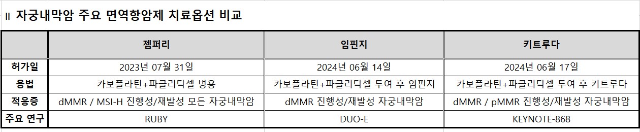 세 약물 모두 자궁내막암 1차 치료옵션으로 FDA 허가를 획득했지만, 적응증 별로 상이한 만큼 환자 입장에서는 다양한 치료옵션을 누릴 수 있을 것으로 기대된다.