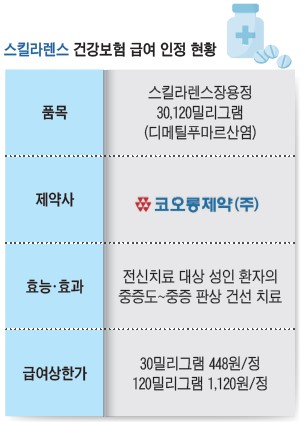 장기효과와 안전성이 입증된 코오롱제약의 중등도 및 중증 판상 건선 치료제 스킬라렌스장용정(성분명 디메틸푸마르산염)의 최근 두 차례의 급여기준의 개선으로 처방이 확대될 수 있을지 관심이 모인다.