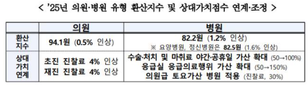 24일 보건복지부가 건강보험정책심의위원회를 열고 '2025년도 의원급 환산지수 0.5% 인상 및 초·재진료 4% 인상' 결정했다.