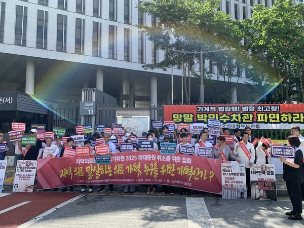 26일 강원의대 및 충북의대 비대위 교수들이 세종 복지부 앞에서 의대정원 정책으로 대한민국 의료가 절체절명의 위기 상태라며 집회를 개최했다.
